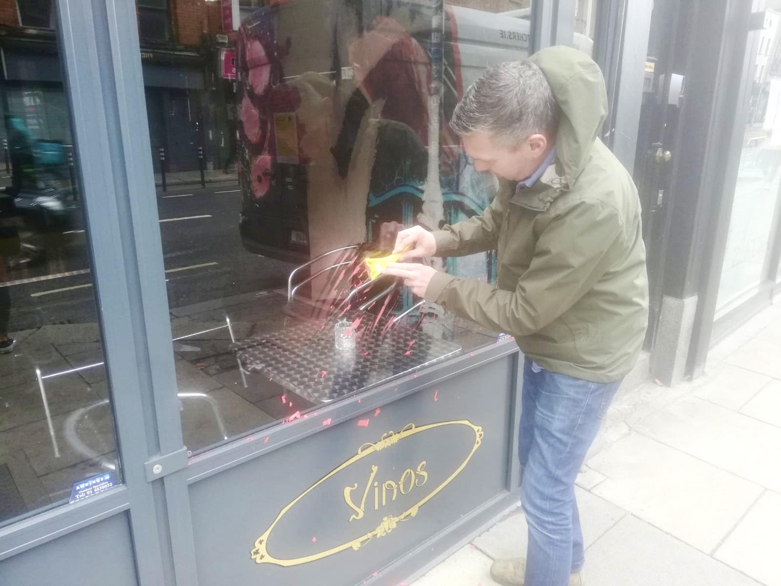 "Had a wee cry this afternoon - rocked up to clean the graffiti off our window to find it gone @thechickenkev & the boys from @againstthegraindub had removed it (Kev was caught on camera!!)"